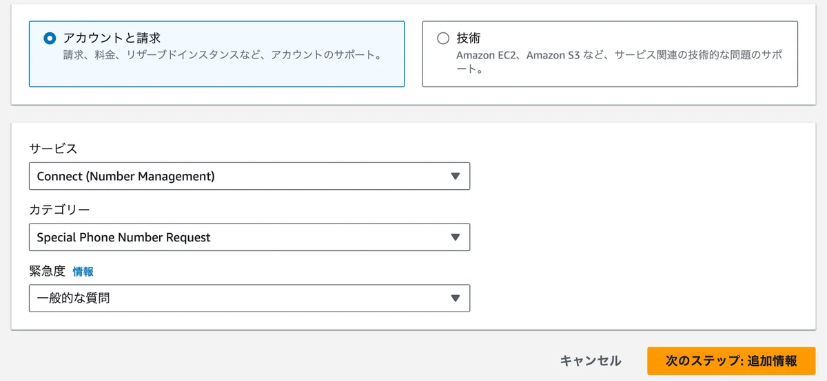 Amazon Connectで電話番号を取得する際に、下記画像のようにサポートへ問い合わせをするように促されます。